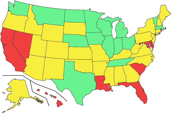 No reciprocity (no admission on motion): California, Delaware, Florida, Hawaii, Louisiana, Maryland, Nevada, Rhode Island, South Carolina.